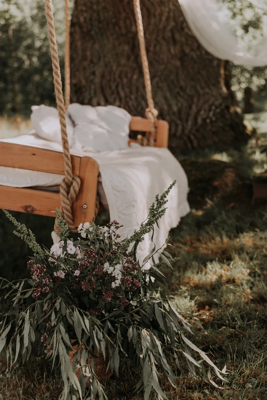 Fotonurgaks kujunes talu uhke tamme küljes rippuv suur kiik. Madratsi katmiseks valisin valge kaheksakanna motiiviga päevateki. Kiige kohale riputasin valge õhulise dülli ja murule puu alla asetasin üksikud korviseaded, et fotonurk ülejäänud dekoratisoondidega siduda.