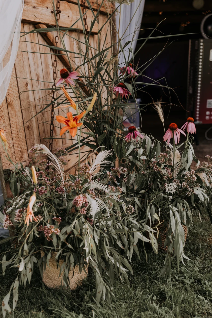 Valmistasin kahes suuruses seadeid, mis kaunistasid peamiselt suure rehehoone mõlemat sissepääsu. Kasutasin lillepotist ja kanavõrgust loodud konstruktsioone, mis hoidsid varred kenasti paigas. Lillepotis olevad seaded asetasin omakorda korvidesse, et tulemus oleks ühtlane ja loomulik.