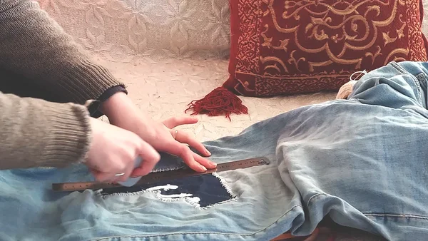 Seejärel kinnitasin paiga augu servade külge. Et see töö kergem oleks, tuleb enne muidugi paik nööpnõeltega pükste enda külge fikseerida. Suure augu ja kitsa püksisääre puhul võib see natuke keeruline olla, sest manööverdamisruumi napib.